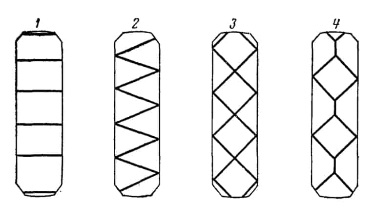 В таких устройствах окружности из цепочек соединяются отрезками не по прямой, а по диагонали крест-накрест. Так получается характерный ромбовидный рисунок.