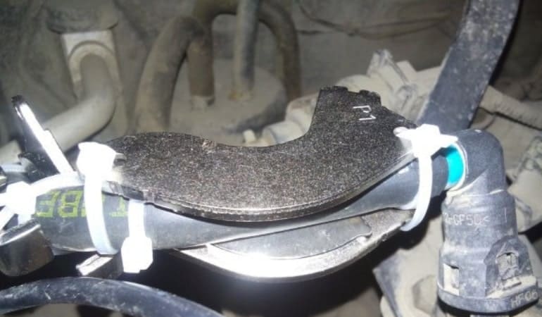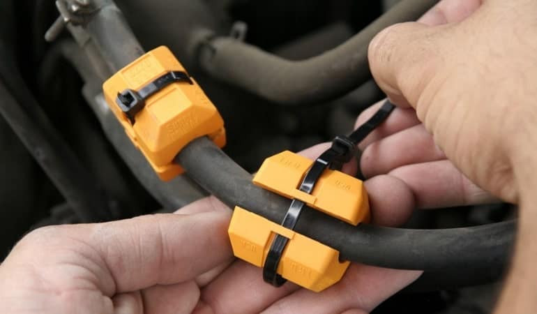 - Разместите магниты друг напротив (так чтобы магниты притягивались друг другу по разные стороны от топливного шланга) и надежно закрепите при помощи пластиковых кабельных стяжек.