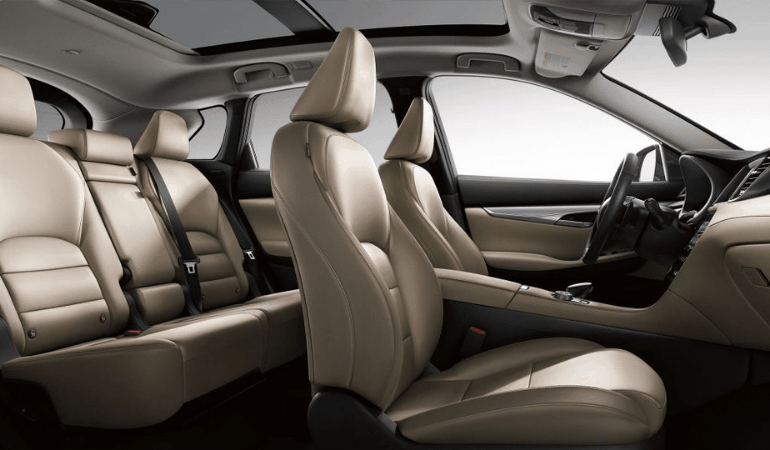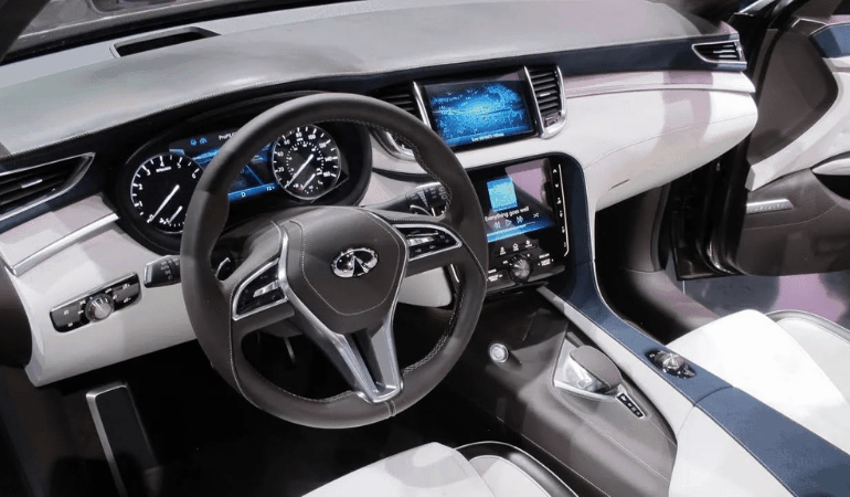Сидения в инфинти qx50 выполнены из белой кожи, особо устойчивой к износу. Задний ряд спокойно разместит троих взрослых человек. Руль также получил кожаную отделку.