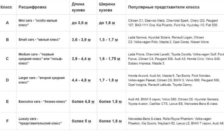 классы автомобилей A B C D E таблица