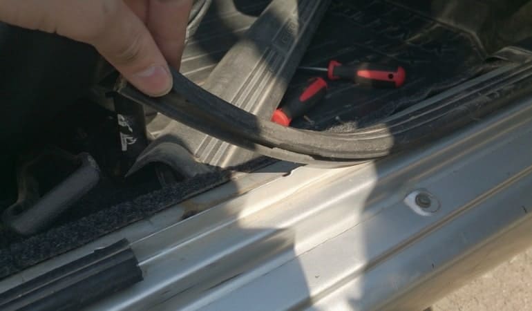 - Снимите защиту с порогов машины, чтобы подобраться к уплотнителю.