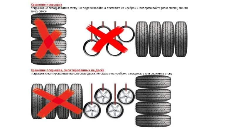 Хранить резину полагается в прохладном, затемненном и сухом помещении. Слишком высокая температура, влажность и солнце губительны для резиновых изделий. Шины на дисках следует штабелировать для хранения, а пустые покрышки составлять одну к другой вертикально.