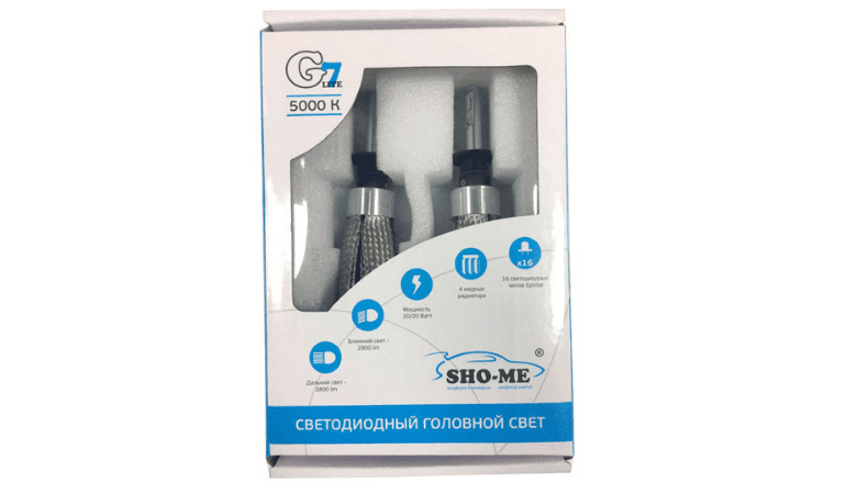 - SHO-ME G7 lite – в основе версии lite лежит 16 светодиодов серии Epistar, а не Филипс, как у базовой версии модели. Излучают чистый белый свет 2800лм, с температурой 5000К и четкой световой границей. Система охлаждения состоит из гибких плетеных медных шин. Работоспособность ламп возможна при температуре от -40 до +105С. В конструкцию входят дополнительные обманки для обхода бортового компьютера. Мощность – 20 Вт, гарантия производителя – 12 месяцев, стоимость – 3500 р.