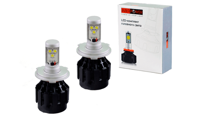 - InterPower – проверенные светодиодные лампочки, работающие на основе элементов Philios. Потребляют мощность в 40Вт и выдают ровный световой поток кристально-белого цвета в 4800 лм, с температурой свечения 5000 К. Благодаря маленьким размерам светодиодов производителям удалось создать световой пучок аналогичный пучку лампы накаливания. Прочный алюминиевый корпус и пассивная система охлаждения гарантируют срок эксплуатации в 50 000 часов. Конструктивной особенностью является возможность смены положения радиатора охлаждения, что делает установку простой и быстрой. Цена комплекта – 3800 рублей.
