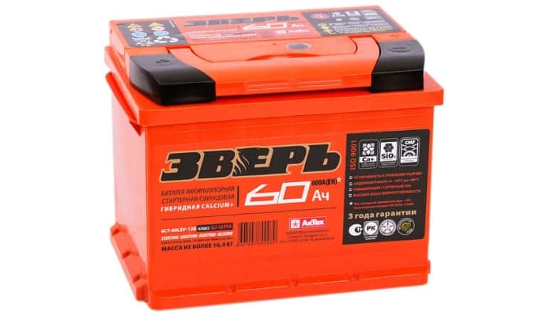 - АкТех ЗВЕРЬ Asia – отечественная модель с емкостью 60 Ач и токов в 600А стоит всего 4000 р. Отлично переносит морозы Северной части страны, отличается длительным сроком службы. Подходит лучше для инжекторных авто с объемом мотора 1,6-2,8 л. и карбюраторных – до 1,8 л. Хорошее соотношении цены и качества. Надежный, герметичный, с корпусом высокой прочности из полипропилена, индикатором заряда и электродами с улучшенной геометрией. Из минусов можно отметить большой вес (порядка 16,5 кг) и немаленькие габариты.