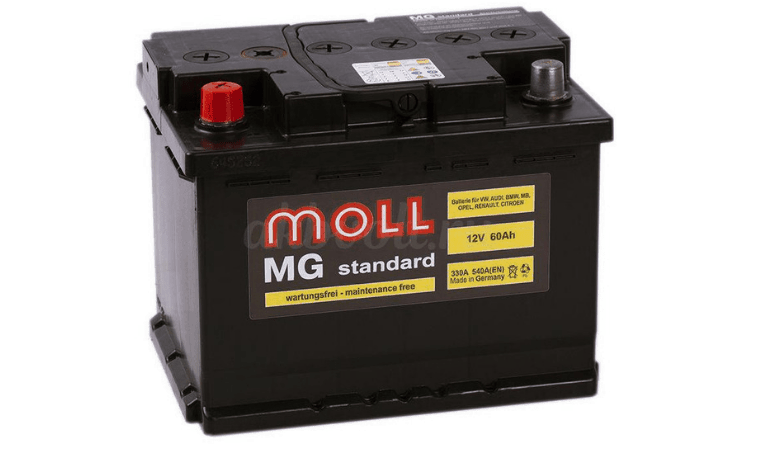 - Moll MG Standart 6СТ-60 – качественный немецкий вариант, ток 550А, 60 Ач. Необслуживаемый, надежный и безопасный. Вибро и ударостойкий. Выдерживает морозы и сильные нагрузки. Отличается большим гарантийным сроком – 40 месяцев. Цена довольно высокая – 6000-7000 рублей.