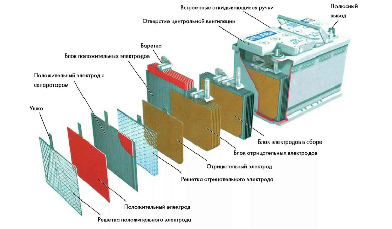 За более чем полутора вековую историю автомобильные аккумуляторы практически не изменились. Они по-прежнему состоят из: корпуса, крышки, электролита (водного раствора серной кислоты), разделительных пластин, электродов и клемм.