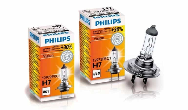 - Philips Vision +30% – образцы немецкого производства излучают направленный белый световой поток с температурой в 3200К. Практически аналогичны заводским элементам. Устойчивы к вибрации и тряске. Отличаются доступной стоимость порядка 300 р. К минусам можно отнести размытую световую границу.