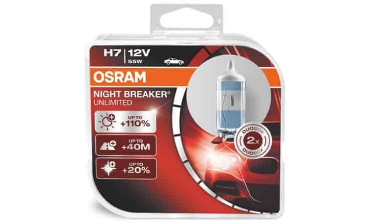 - Osram Night Breaker Unlimited + 110% – надежные лампы с увеличенной на 110% яркостью и белым светов (3400К) от немецкого производителя. Отличаются приемлемой стоимостью в 1500 рублей за пару. К минусам модели можно отнести не самый высокий срок службы и возможность небольшого ослепления встречного транспорта.
