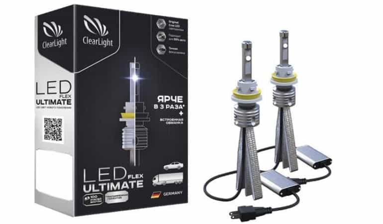 - Clearlight Flex Ultimate – выдают мощный световой поток в 5500 лм и отличаются точной фокусировкой. Оригинальные светодиоды увеличивают яркость в три раза. Модель оснащена надежной системой охлаждения ленточного типа, что обеспечивает надежную, безопасную и долгую работу (срок службы 15 лет). Совместимы практически со всеми типами фар, обладают встроенной “обманкой”, что позволяет избежать ошибок бортового компьютера. Приобрести комплект из двух штук можно за 6000 р.
