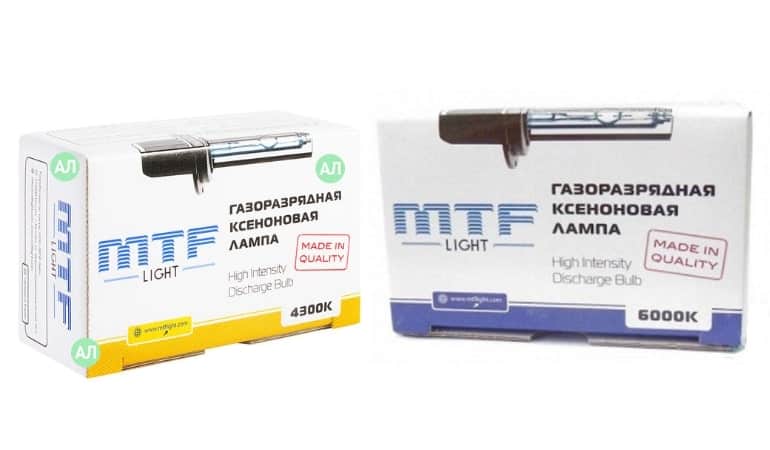 - MTF Light – корейский образец для внештатного ксенонового освещения. Производится в трех вариантах, которые различаются температурой потока света. На выбор потребителя представлены образцы в 4300, 5000 и 6000К. Первый имеет белый оттенок, второй бело-голубой, третий – голубой. Загорается без задержек, даже при холодной пуске. Отличается высокой яркостью и доступной стоимостью порядка 950 р. Это один из лучших бюджетных вариантов.