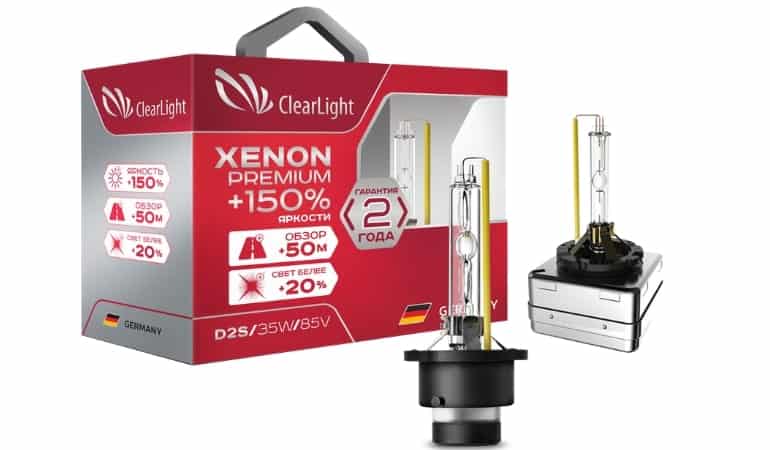 - Clearlight Xenon Premium +150% – отличается высокой яркостью (+150%), увеличивающей обзор на 50 м, белым светом с температурой 5000К и колбой из высокопрочного кварцевого стекла, выдерживающего резкие температурные перепады и высокое давление. Стоимость комплекта из двух штук – 1500 р.