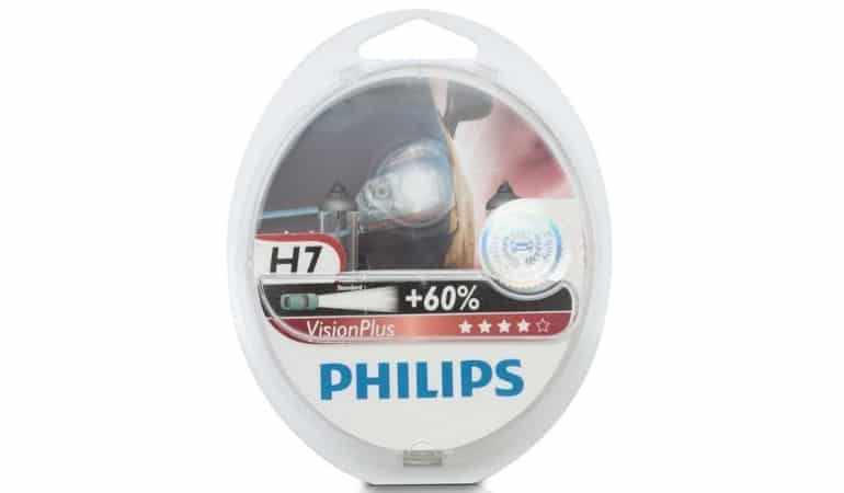 - Philips Vision Plus +60% – улучшенный, более мощный вариант ламп предыдущего образца. Реальная мощность составляет всего 49 Вт, против заявленной 55-ти. Хорошо освещают дорогу. Увеличивают зону освещения перед транспортным средством на 25 метров, благодаря повышению яркости на 60%. К недостаткам можно отнести сравнительно большую цену в 700-800 рублей, а так же чувствительность к высокому напряжению.