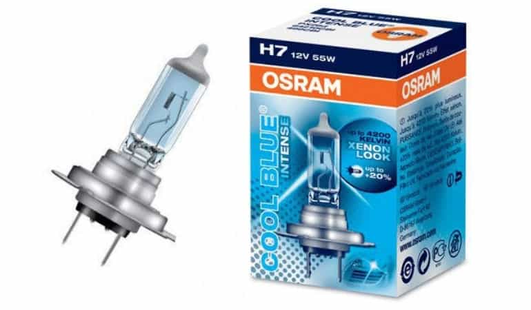 - OSRAM Cool Blue Intense – отличаются бело-голубым цветом свечения в 4200К, наиболее приближенным к реальному ксеноновому. Выдают на 20% больше яркости – 1500 лм. Обойдутся покупателю в 1000 рублей за пару. Из минусов можно выделить недостаточное освещение в дождь.