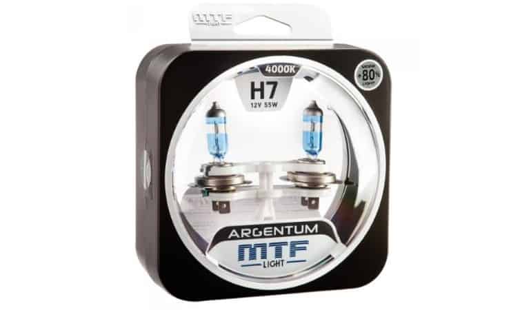 - MTF light ARGENTUM +80% – бюджетный вариант наибольшей яркости, с мощностью в 55W и белым цветом – 4000К. Выдают на 80% больше света, чем штатные галогеновые образцы, освещая путь на 15 м дальше. Изготовлены из специального прочного стекла, стоят 800-900 р. Существенных недостатков у модели не выявлено.