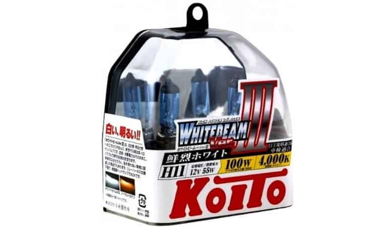 - KOITO Whitebeam – японская модель повышенной яркости, почти вдвое ярче конкурентов. Имеет цветовую температуру 4200K, что наиболее близко к естественному дневному освещению, однако в дождь видимость заметно теряется. Отличается колбой синего цвета. Приобрести пару koito можно за 2000 р.