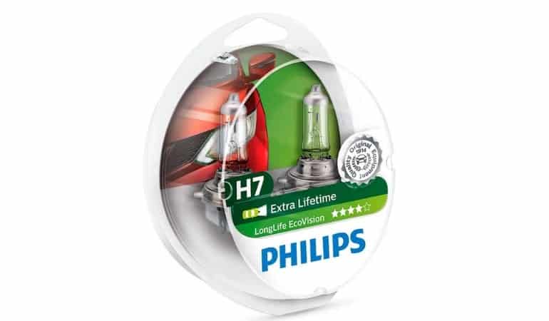 - Philips LongLife EcoVision – отличаются повышенным в 4 раза сроком службы – 3 года или 100 000 км пробега. Выдают желтоватого оттенка (3100К), что не многим нравится. Стоят в районе 550 – 700 рублей.